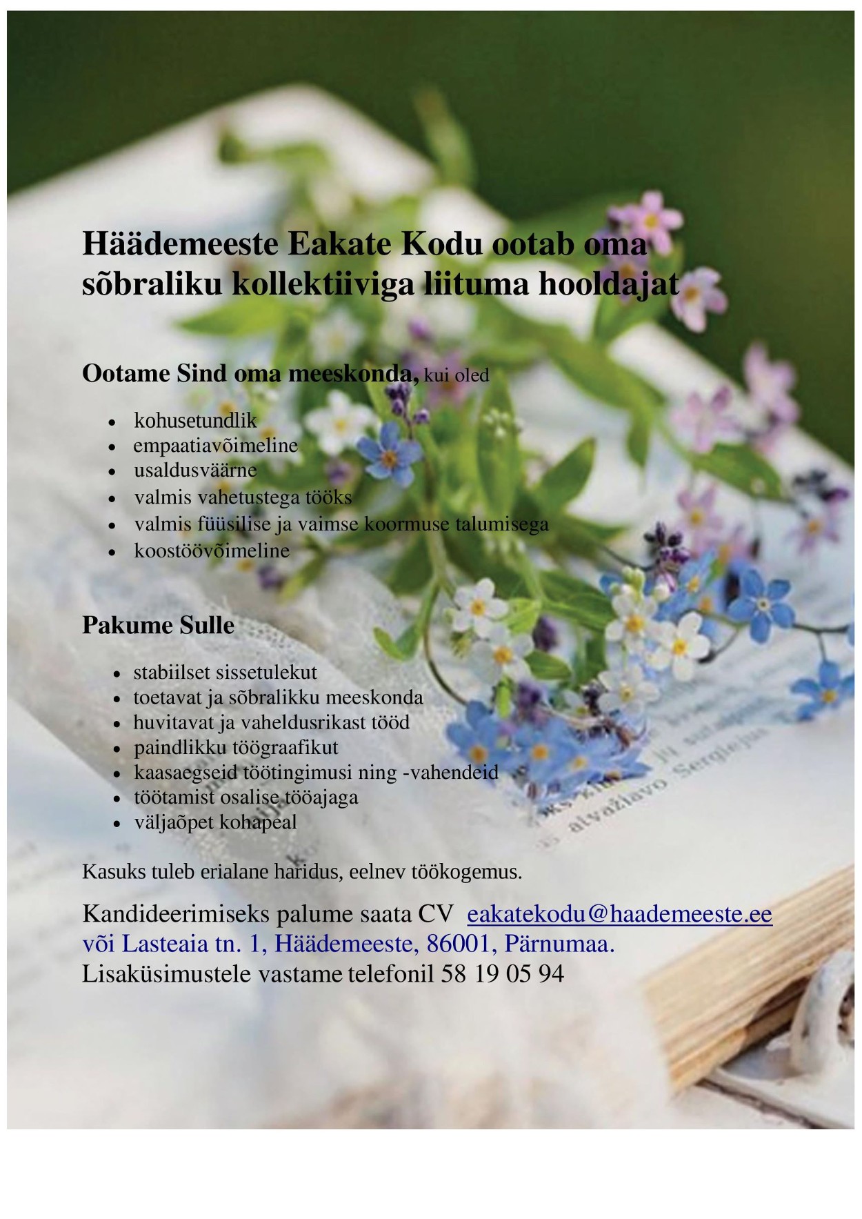 Pakume tööd sulle, suure südamega hooldustöötaja Post published:august 11, 2024 Post category:Tööpakkumised Samal teemal Ootame sõbraliku meeskonnaga liituma hooldustöötajat veebruar 17, 2023 TULE MEILE TÖÖLE! juuni 16, 2020 Ootame oma sõbraliku kollektiiviga liituma hooldustöötajat detsember 14, 2022